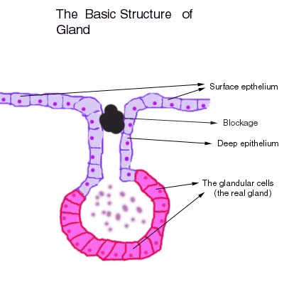 Growths are not the only cause of lumps. Blocked glands and abnormal fluid collections can also cause lump formation. This is an important cause of lumps in the female reproductive organs. The next drawings will explain how blocked glands cause lumps.