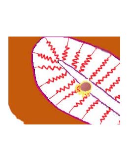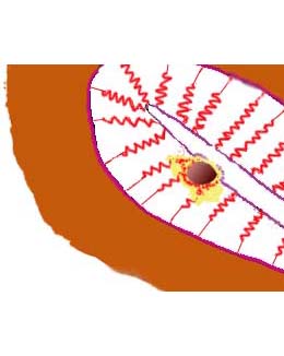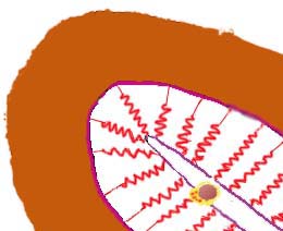 The embryo is dissolving the endometrium. In plain terminology it is digging a hole in the endometrium to bury itself in the endometrium. The next and the following drawings shows an enlarge view of this process. |