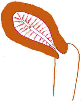 The first illustration gives an enlarged view of the process of fertilization. See fertilization . It shows a schematic representation of fertilization and the movement of the fertilized egg through the fallopian tube. The sperms are schematically represented by the small red structures. The red dot represents the head and the red line the tail. The yellow-brown sphere represents the egg cell. Fertilization is illustrated in the entrance to the fallopian tube. A sperm attaches itself to the egg cell. It penetrates the egg cell while discarding its tail. The egg is now fertilized and we changed its appearance to a purple sphere. The green arrows indicate how it(the fertilized egg) is moving through the fallopian tube towards the uterine (womb) cavity. |