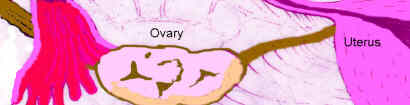 The next drawing illustrates how the ovary is suspended between the side wall of the body and the the uterus.