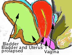 The next drawing illustrates severe prolapse. A large part of the bladder protudes in the vagina. The vagina folds on itself as the severely prolapsed uterus (womb) pulls the upper part of the vagina downwards.