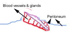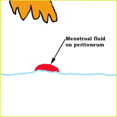 During menstruation the thick premenstrual endometrium is discarded and breaks into pieces. The pieces are discarded with the menstrual fluid into the vagina. Menstrual blood however also escapes trough the upper openings of the womb into the fallopian tubes. The outer opening of the tubes open directly in the peritoneal cavity. (Click here for more information about the peritoneal cavity).