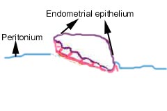 The menstrual fluid consists of blood, endometrial epithelium, endometrial glands, pieces of blood vessels and connective tissue. All these tissue parts are pieces of the discarded endometrium. These pieces find there way into the peritoneal cavity. In some persons these pieces attach themselves to the peritoneum ( the layer covering the peritoneal cavity) and start growing. This will only happen in some individuals and the reasons why are still obscure. The endometrium is now present and growing in a foreign site and is now known as endometriosis.