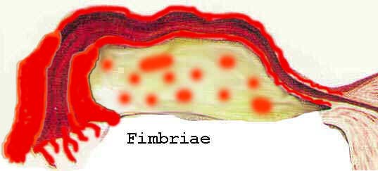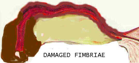 The next two drawings illustrate how inflammation can cause blockage at the entrance of the tube by damaging and effecting the fimbriae.The fimriae stuck together and close the opening of the tube.