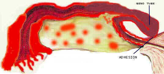 The next drawing illustrates a bend tube with part of the tube adherent to the womb. The lumen is kinked. Due to the swelling and inflammation a sticcky fluid if the ability to clot leaks from surface of the tube. In this case part of the tube got stucked on the wall of the womb adn tube got bend.