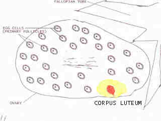 A very important change is taking place in the ovary. A new structure is developing from the remains of the follicle which released the egg cell. This new structure is called a CORPUS LUTEUM (Latin meaning yellow body). The corpus luteum is the only structure which produces the hormone progesterone in significant quantities.