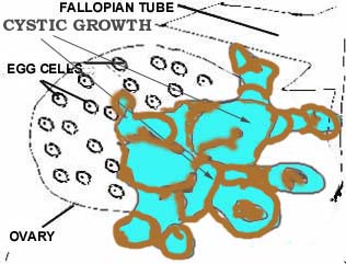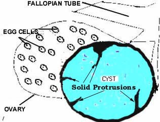 Ovarian cysts can become cancerous. Any cyst with solid areas, persist longer than 4 menstrual cycles or keep on enlarging should be further investigated. This drawing illustrates cystic ovarian cancer. Multiple cysts joint by solid tissue invades the ovary and surrounding tissues.