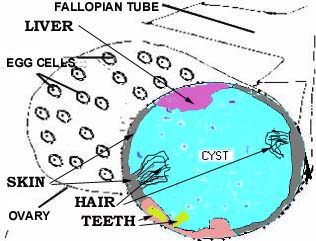 This cyst contains abnormal tissue. It is usually lines with skin containing hair and hair follicles, teeth, liver , bone etc. They probably originate from egg cells which start developing on their own , only to produce abnormal chaotic tissue.
